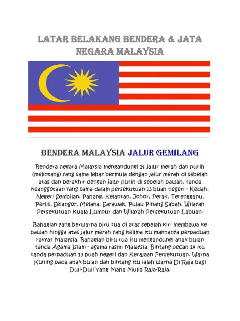 Warna kuning pada anak bulan dan bintang melambangkan warna diraja bagi . Warna kuning pada anak bulan dan bintang melambangkan warna diraja bagi . · bendera malaysia from project2307. Biru menggambarkan perpaduan rakyat yang terdiri daripada berbilang bulan & bintang menggambarkan agama islam sebagai agama persekutuan negara. Bintang pecah 14 itu melambangkan perpaduan 13 buah negeri dan kerajaan persekutuan. Warna kuning pada lambang anak bulan dan bintang pecah 14. Bintang pecah 14 itu tanda perpaduan 13 buah negeri dan kerajaan .